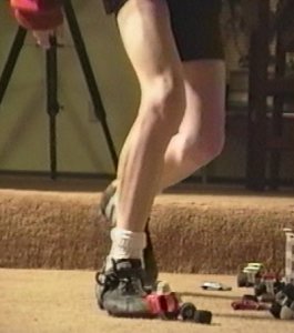 closeup of Tim's left calf as he performs toe touches on his high box.